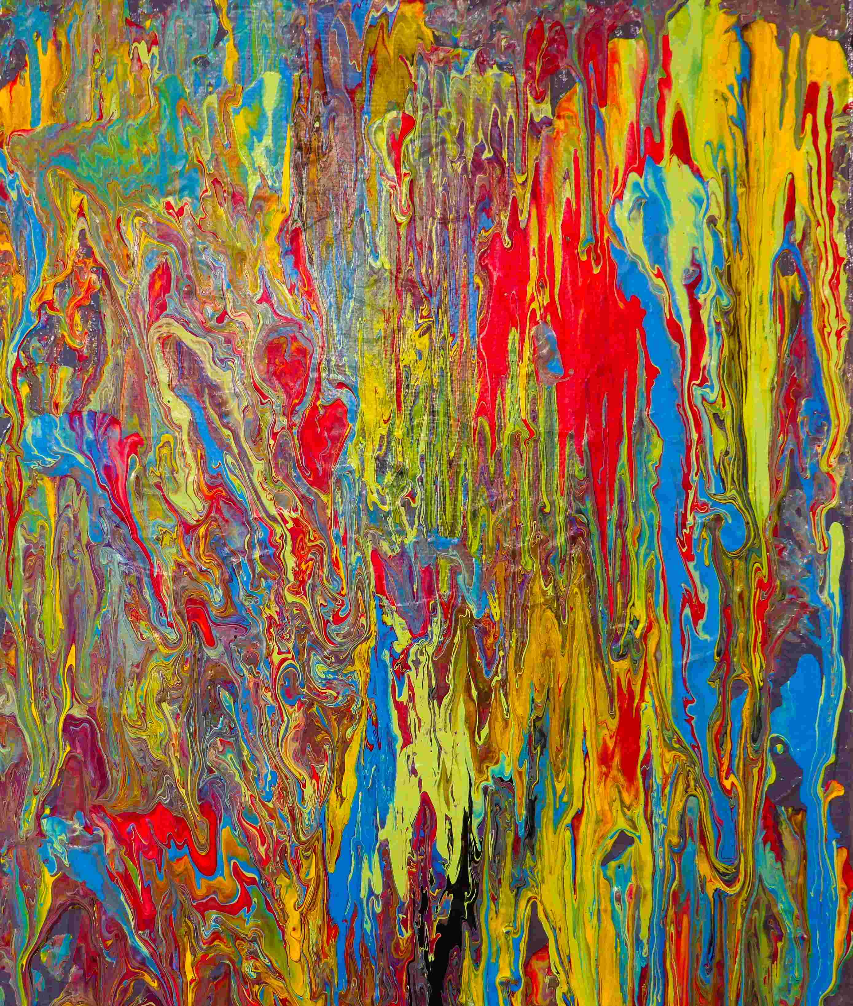 Die mit der Acryl-Fließtechnik entstandenen Bilder lassen die Farben ineinander tanzen, sich bewegen und regen die Fantasie an: Ist das eine verwunschene Landschaft mit See, in dem ein bunter Fisch schwimmt? Ist das ein Wald bei Nacht, in dem die Bäume farbig leuchten?